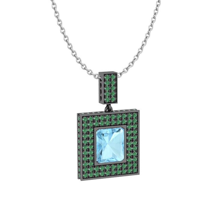 Akuamarin ve kök zümrüt 925 ayar siyah rodyum kaplama gümüş kolye (40 cm gümüş rolo zincir)
