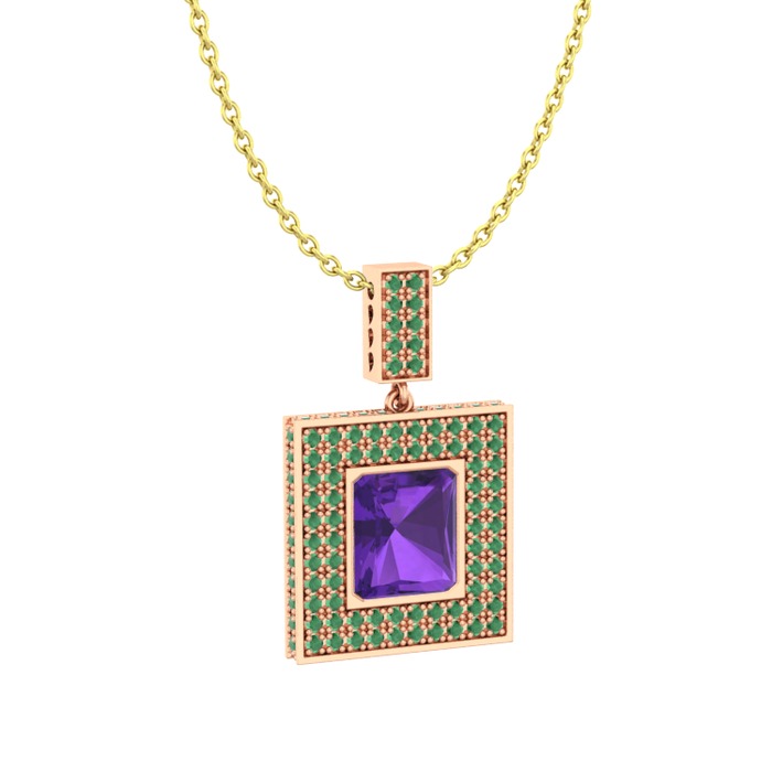 Ametist ve kök zümrüt 925 ayar rose altın kaplama gümüş kolye (40 cm altın rolo zincir)