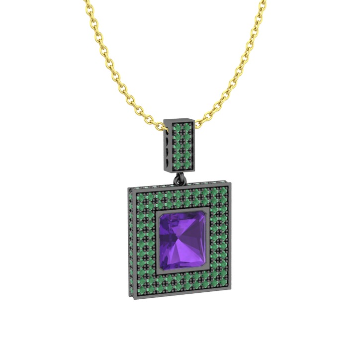 Ametist ve kök zümrüt 925 ayar siyah rodyum kaplama gümüş kolye (40 cm gümüş rolo zincir)