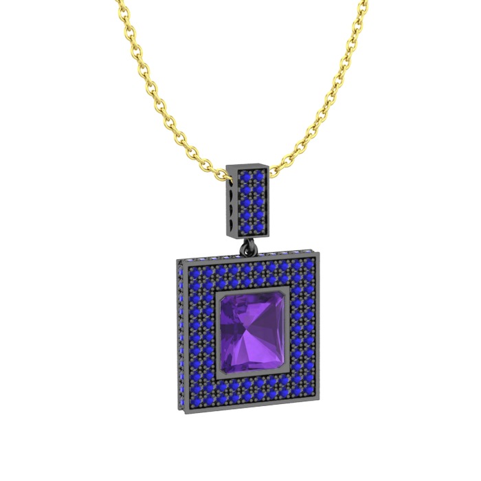 Ametist ve lab safir 925 ayar siyah rodyum kaplama gümüş kolye (40 cm altın rolo zincir)