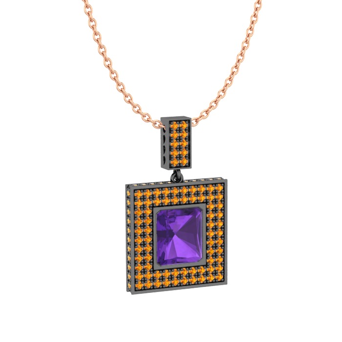 Ametist ve sitrin 925 ayar siyah rodyum kaplama gümüş kolye (40 cm rose altın rolo zincir)