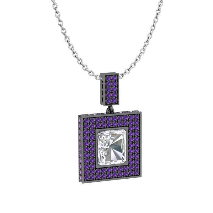 Beyaz zirkon ve ametist 925 ayar siyah rodyum kaplama gümüş kolye (40 cm gümüş rolo zincir)