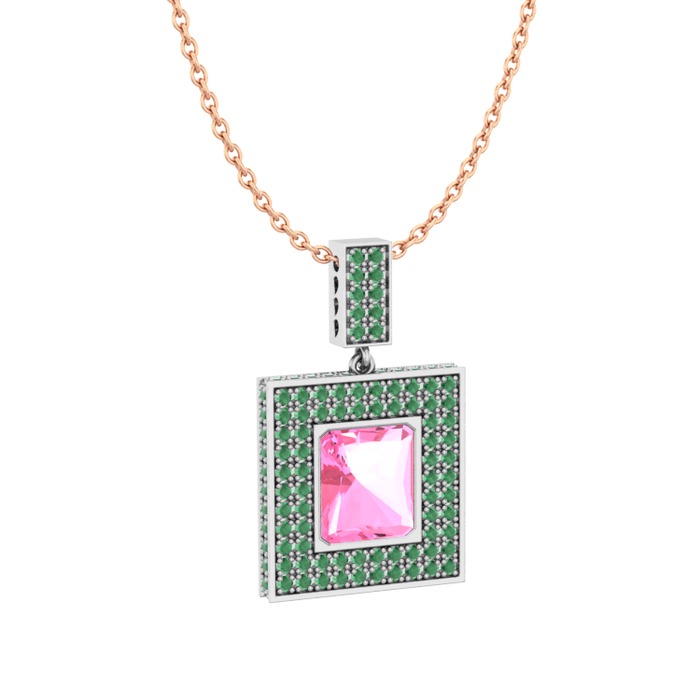Pembe kuvars ve kök zümrüt 18 ayar beyaz altın kolye (40 cm rose altın rolo zincir)