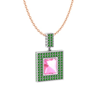 Pembe kuvars ve yeşil kuvars 18 ayar beyaz altın kolye (40 cm rose altın rolo zincir)