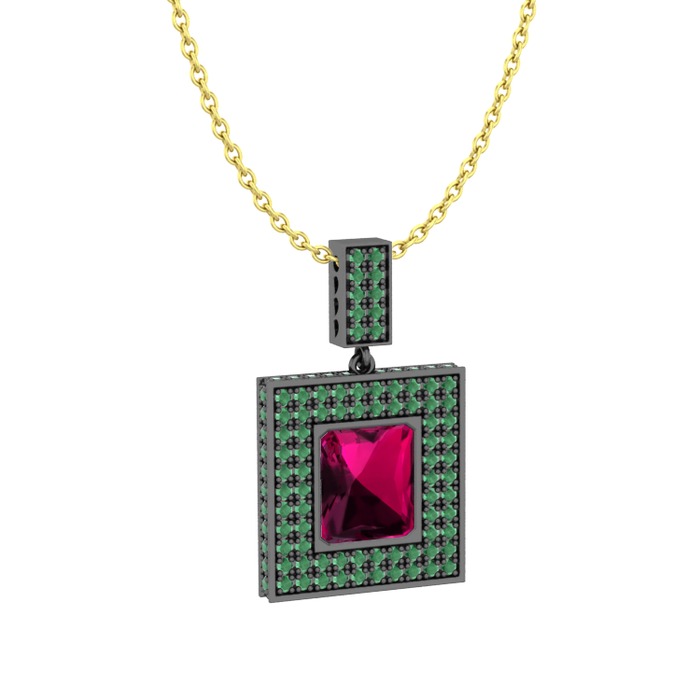Rodolit garnet ve kök zümrüt 925 ayar siyah rodyum kaplama gümüş kolye (40 cm altın rolo zincir)