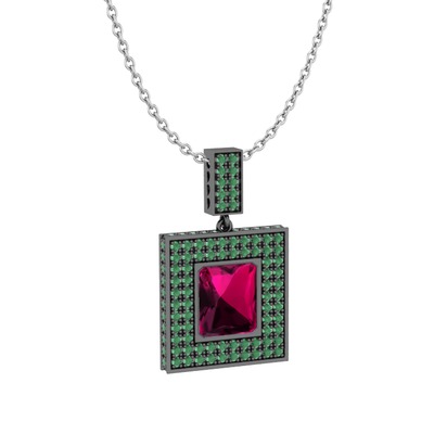 Rodolit garnet ve kök zümrüt 925 ayar siyah rodyum kaplama gümüş kolye (40 cm beyaz altın rolo zincir)