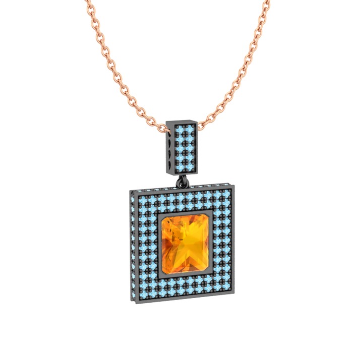 Sitrin ve akuamarin 925 ayar siyah rodyum kaplama gümüş kolye (40 cm rose altın rolo zincir)