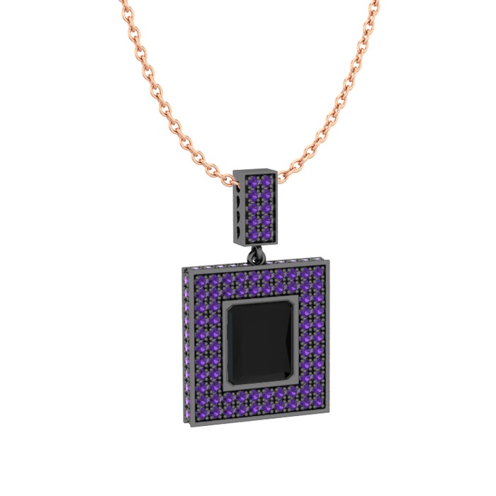 Siyah zirkon ve ametist 925 ayar siyah rodyum kaplama gümüş kolye (40 cm rose altın rolo zincir)