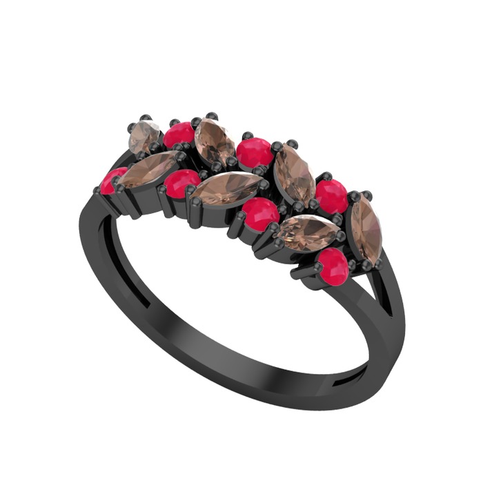 Dumanlı kuvars ve kök yakut 925 ayar siyah rodyum kaplama gümüş yüzük