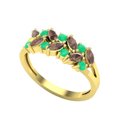 Dumanlı kuvars ve kök zümrüt 18 ayar altın yüzük