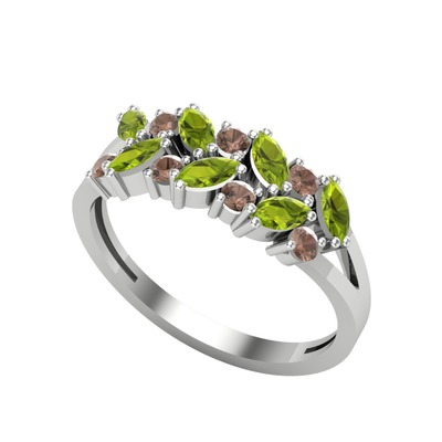 Peridot ve dumanlı kuvars 14 ayar beyaz altın yüzük