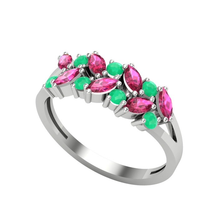 Rodolit garnet ve kök zümrüt 14 ayar beyaz altın yüzük