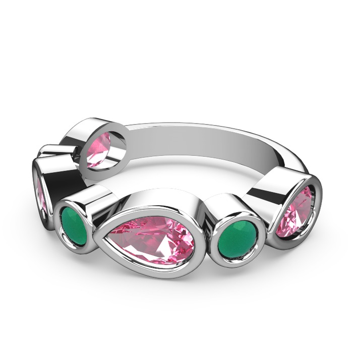 Pembe kuvars ve kök zümrüt 8 ayar beyaz altın yüzük