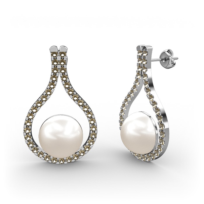 Inci ve dumanlı kuvars 14 ayar beyaz altın küpe