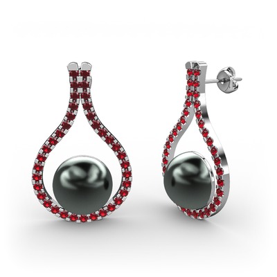 Siyah inci ve garnet 18 ayar beyaz altın küpe