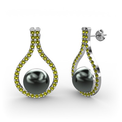 Siyah inci ve peridot 18 ayar beyaz altın küpe