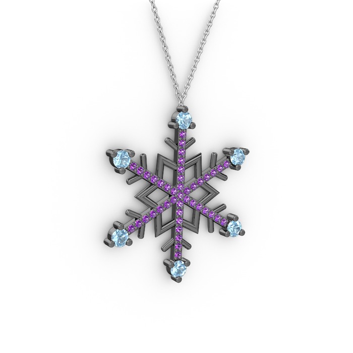 Akuamarin ve ametist 925 ayar siyah rodyum kaplama gümüş kolye (40 cm beyaz altın rolo zincir)