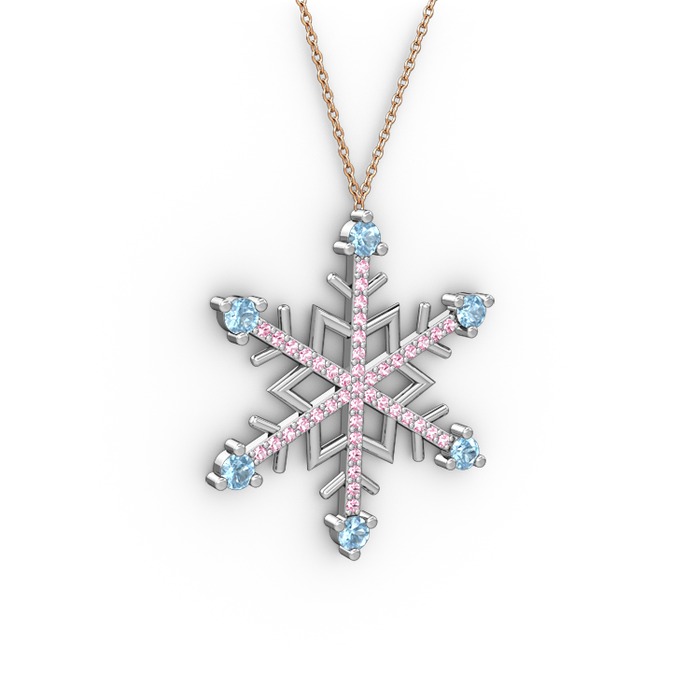 Akuamarin ve pembe kuvars 18 ayar beyaz altın kolye (40 cm rose altın rolo zincir)
