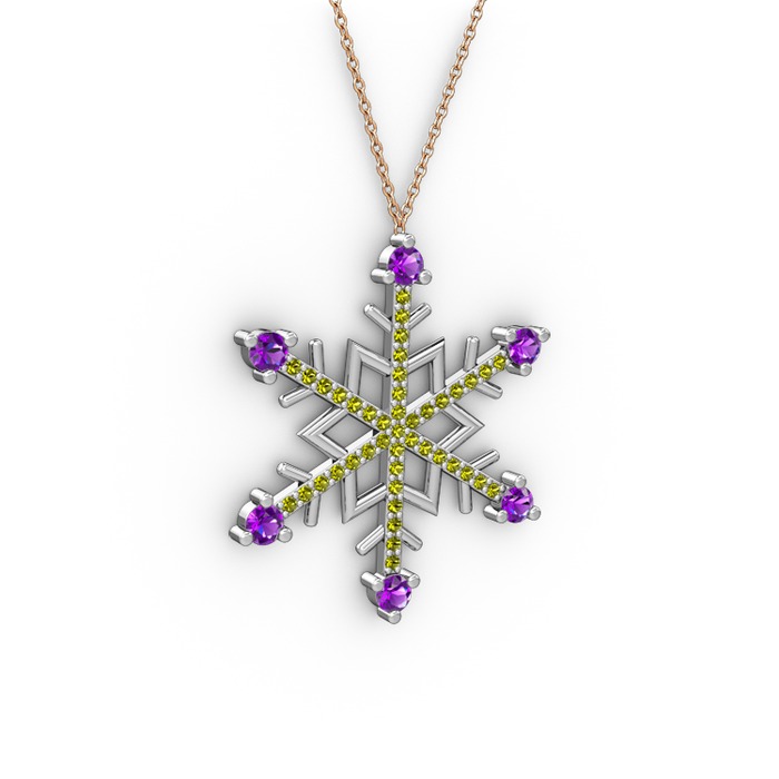 Ametist ve peridot 14 ayar beyaz altın kolye (40 cm rose altın rolo zincir)