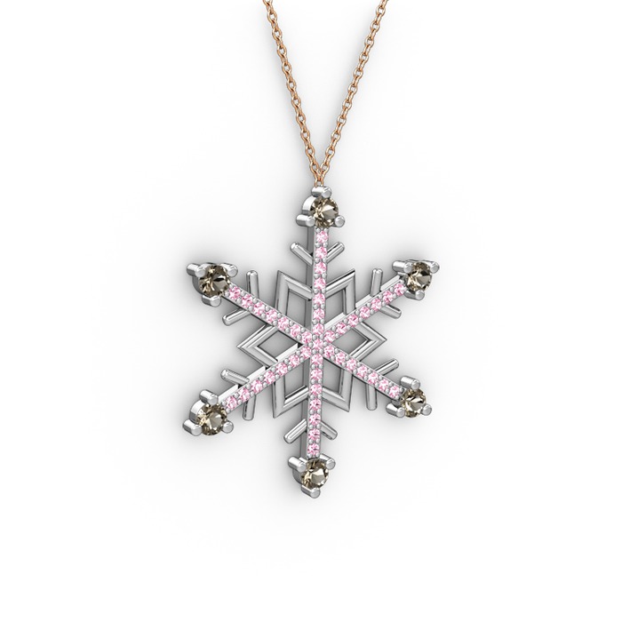 Dumanlı kuvars ve pembe kuvars 18 ayar beyaz altın kolye (40 cm rose altın rolo zincir)