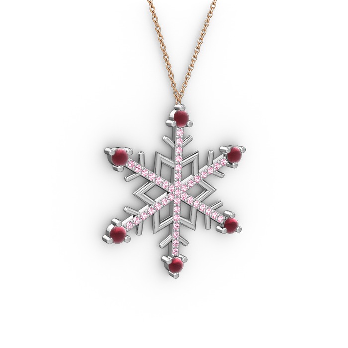 Kök yakut ve pembe kuvars 14 ayar beyaz altın kolye (40 cm gümüş rolo zincir)