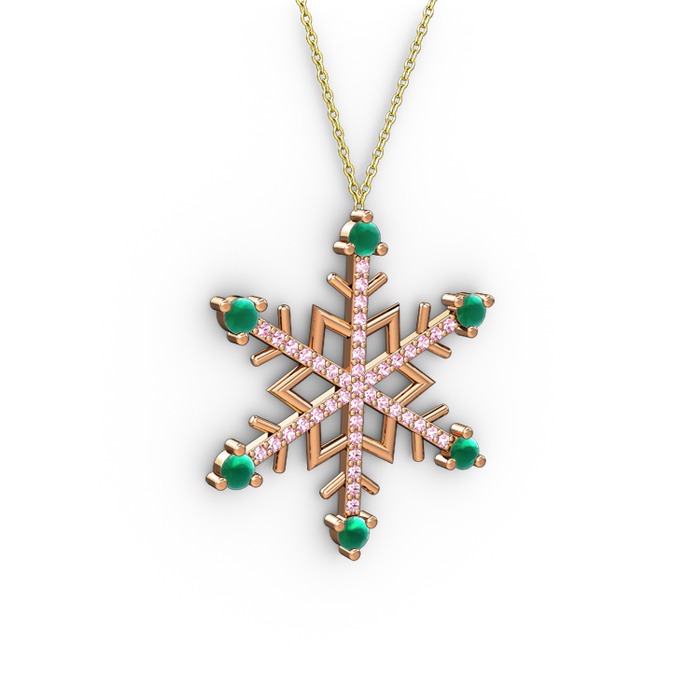 Kök zümrüt ve pembe kuvars 8 ayar rose altın kolye (40 cm altın rolo zincir)