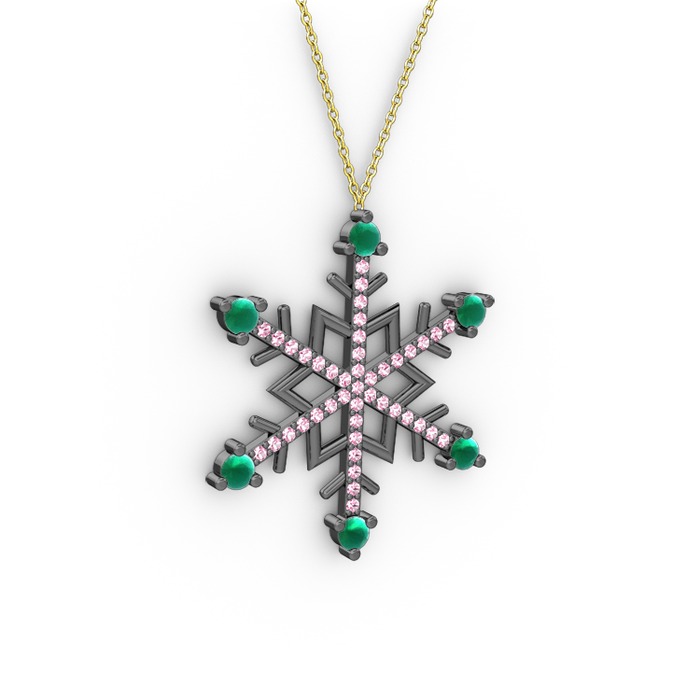 Kök zümrüt ve pembe kuvars 925 ayar siyah rodyum kaplama gümüş kolye (40 cm altın rolo zincir)