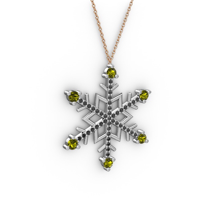 Peridot ve siyah zirkon 14 ayar beyaz altın kolye (40 cm rose altın rolo zincir)