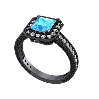 Akuamarin ve beyaz zirkon 925 ayar siyah rodyum kaplama gümüş yüzük