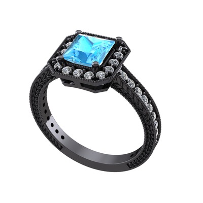 Akuamarin ve pırlanta 925 ayar siyah rodyum kaplama gümüş yüzük (0.484 karat)