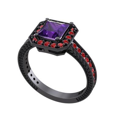 Ametist ve garnet 925 ayar siyah rodyum kaplama gümüş yüzük