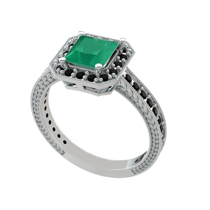Kök zümrüt ve siyah zirkon 8 ayar beyaz altın yüzük