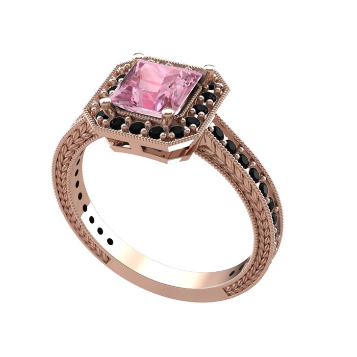 Pembe kuvars ve siyah zirkon 14 ayar rose altın yüzük