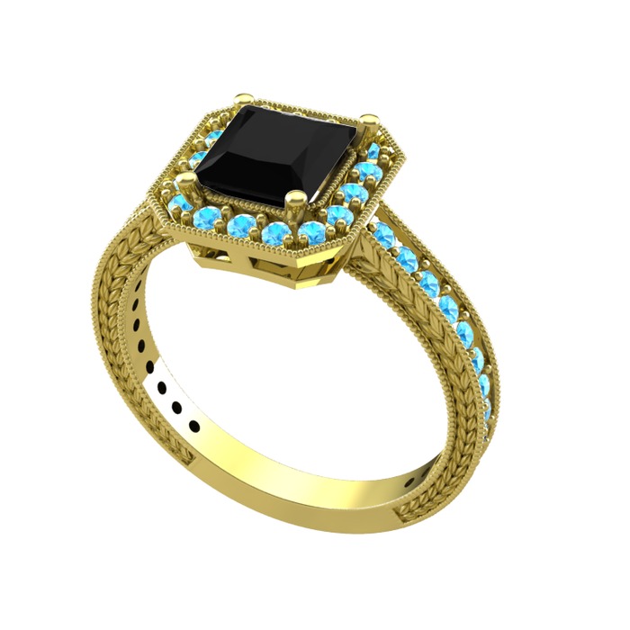Siyah zirkon ve akuamarin 8 ayar altın yüzük