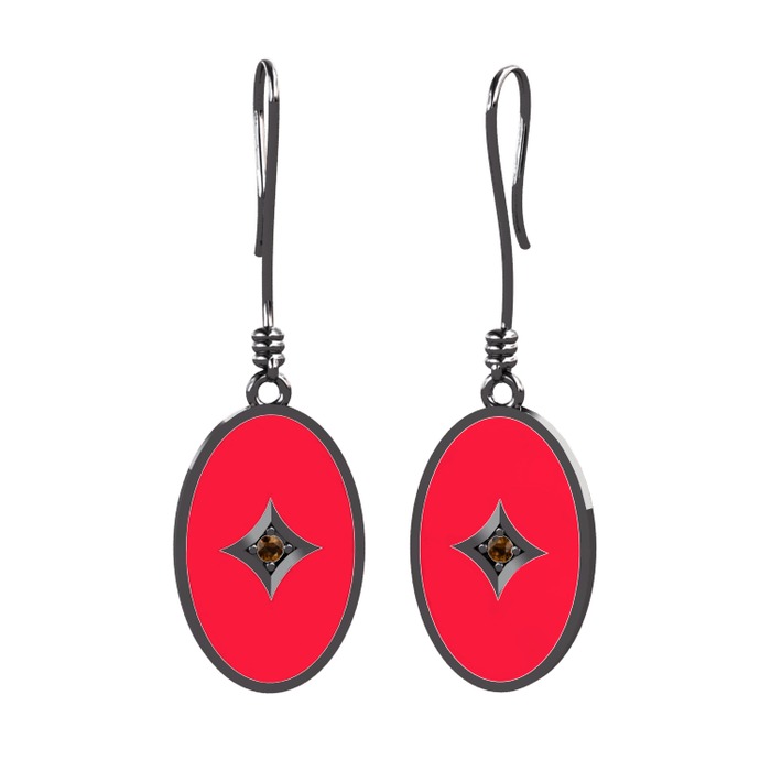Dumanlı kuvars 925 ayar siyah rodyum kaplama gümüş küpe (Kırmızı mineli)