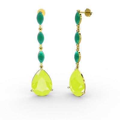 Neon sarı akrilik ve kök zümrüt 18 ayar altın küpe