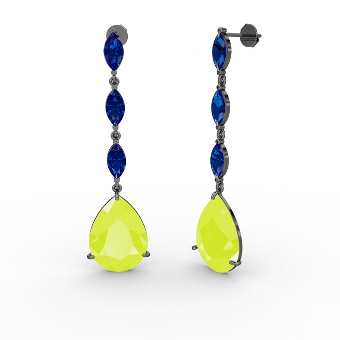Neon sarı akrilik ve lab safir 925 ayar siyah rodyum kaplama gümüş küpe