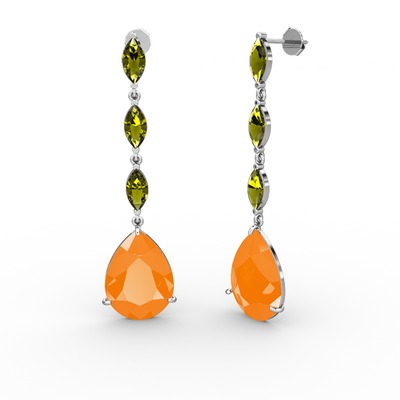 Neon turuncu akrilik ve peridot 18 ayar beyaz altın küpe