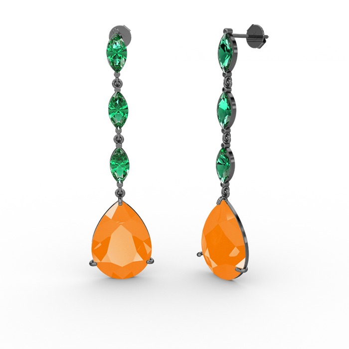 Neon turuncu akrilik ve yeşil kuvars 925 ayar siyah rodyum kaplama gümüş küpe