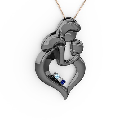 Akuamarin, lab safir ve beyaz zirkon 925 ayar siyah rodyum kaplama gümüş kolye (40 cm rose altın rolo zincir)