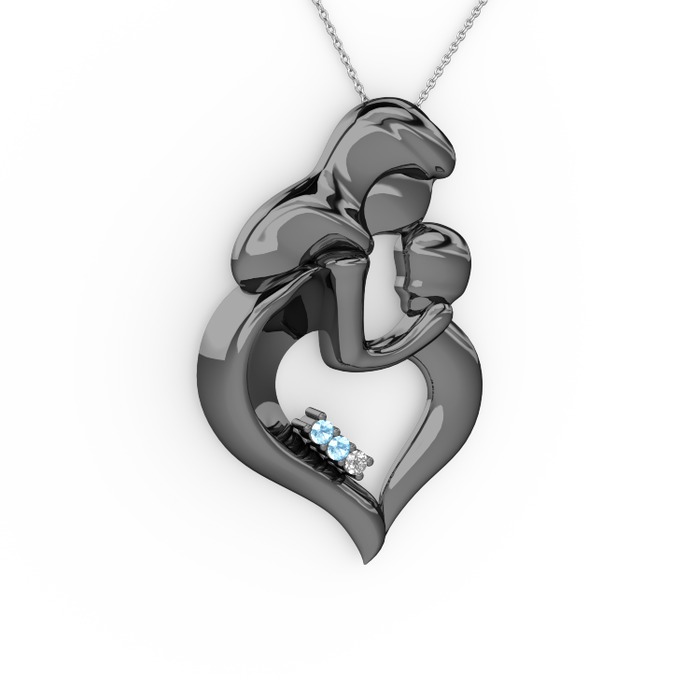 Akuamarin ve pırlanta 925 ayar siyah rodyum kaplama gümüş kolye (0.015 karat, 40 cm beyaz altın rolo zincir)