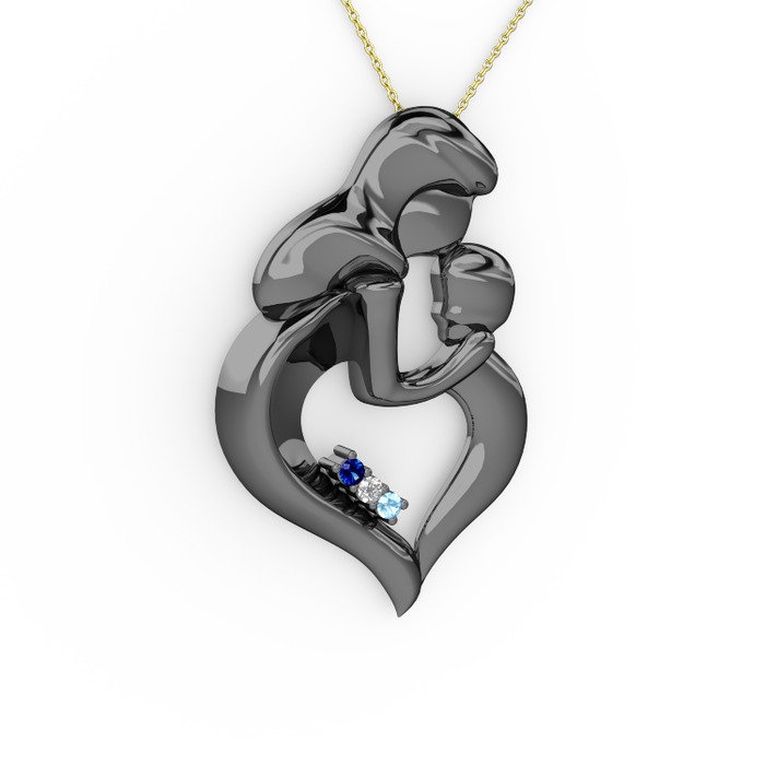 Lab safir, akuamarin ve beyaz zirkon 925 ayar siyah rodyum kaplama gümüş kolye (40 cm altın rolo zincir)