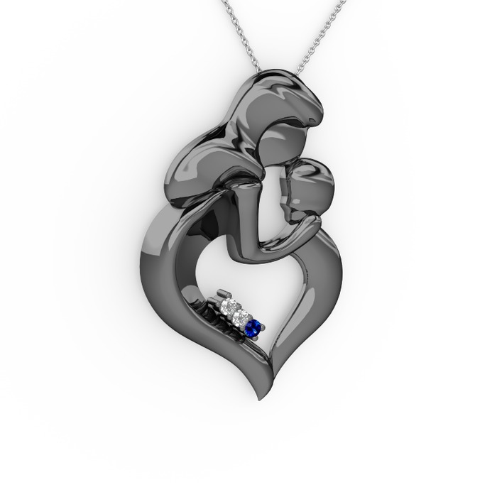Pırlanta, lab safir ve beyaz zirkon 925 ayar siyah rodyum kaplama gümüş kolye (0.015 karat, 40 cm beyaz altın rolo zincir)