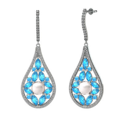 Inci, akuamarin ve beyaz zirkon 18 ayar beyaz altın küpe