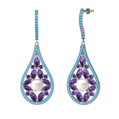 Inci, ametist ve akuamarin 18 ayar beyaz altın küpe