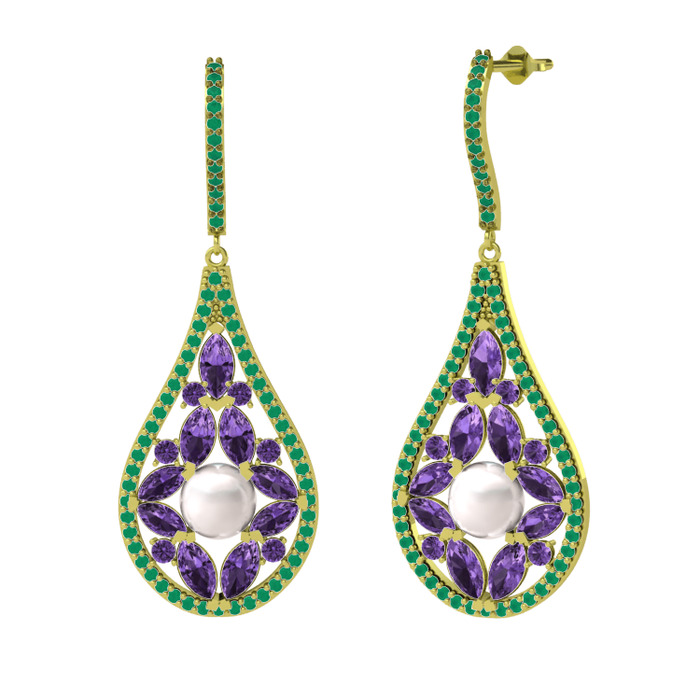 Inci, ametist ve kök zümrüt 8 ayar altın küpe