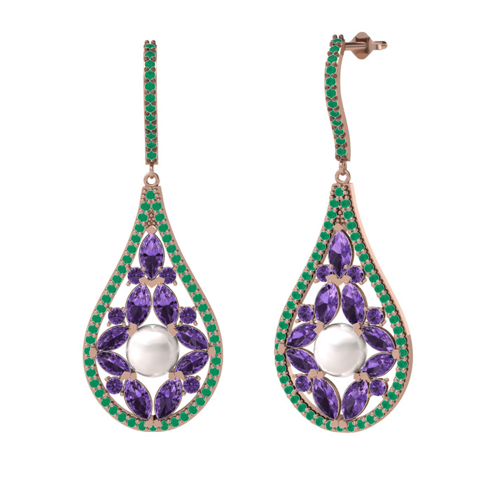Inci, ametist ve kök zümrüt 8 ayar rose altın küpe