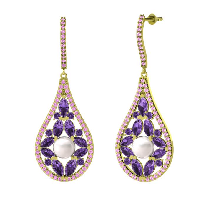Inci, ametist ve pembe kuvars 14 ayar altın küpe