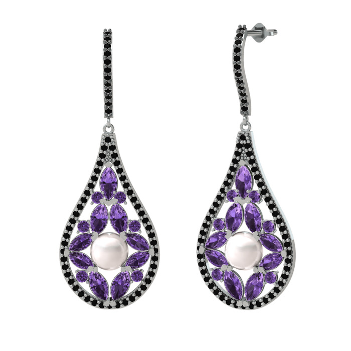 Inci, ametist ve siyah zirkon 18 ayar beyaz altın küpe