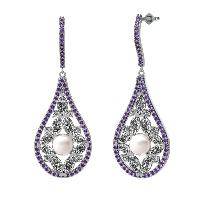 Inci, beyaz zirkon ve ametist 14 ayar beyaz altın küpe